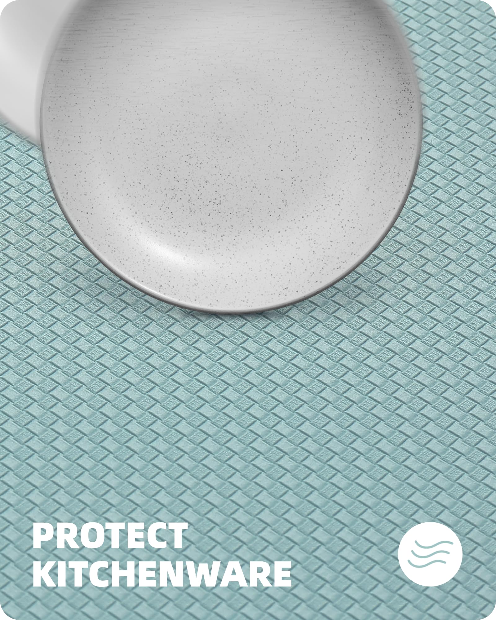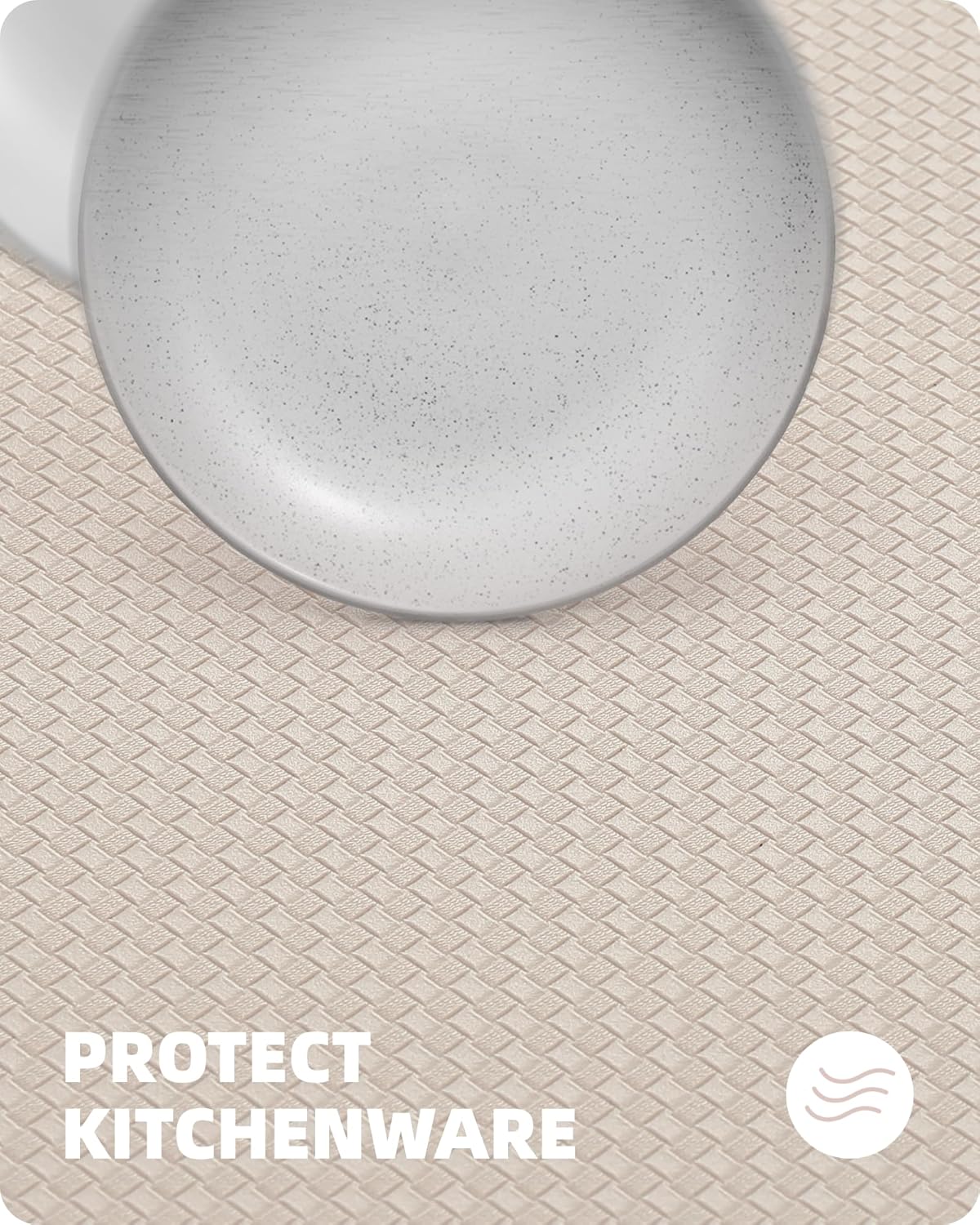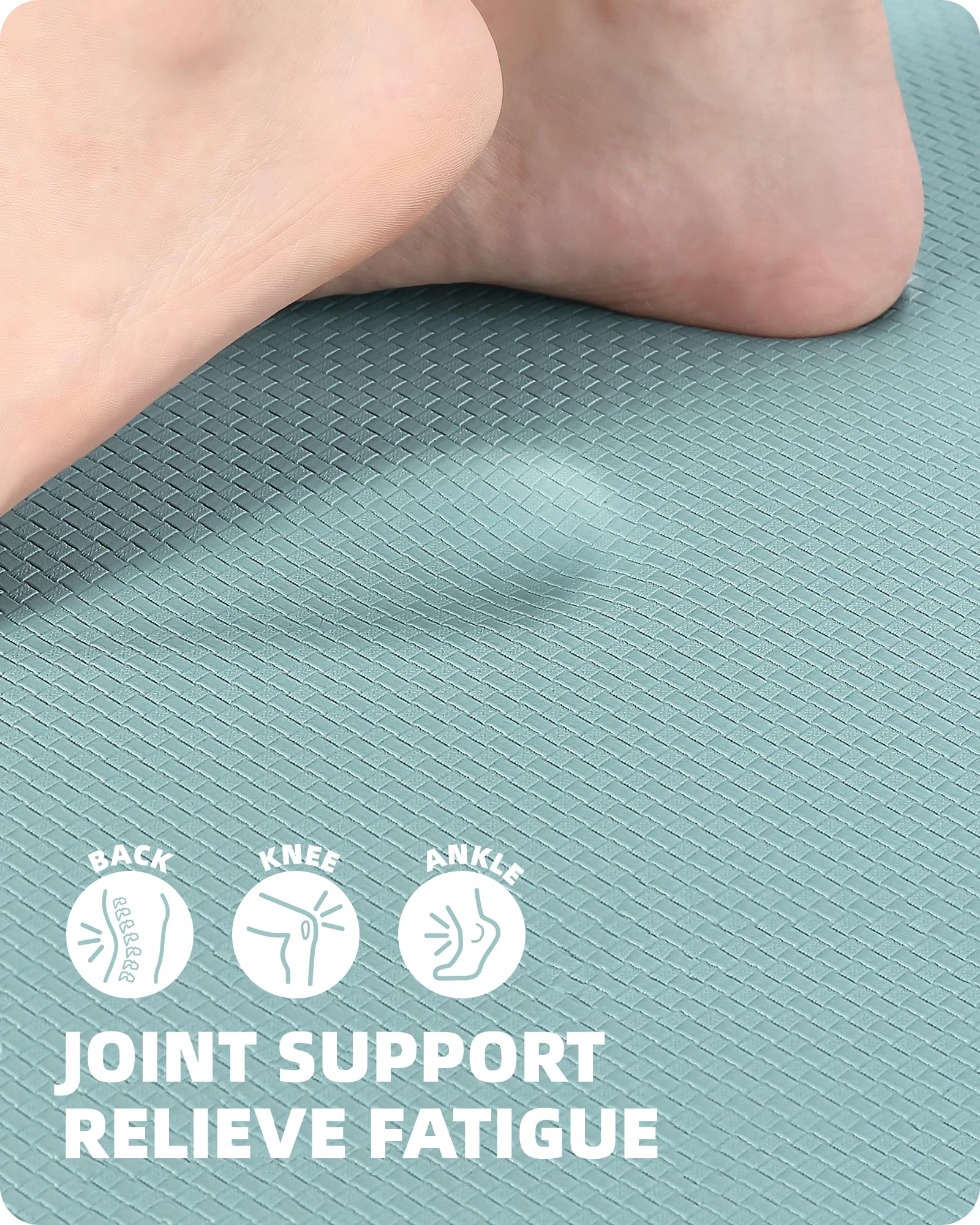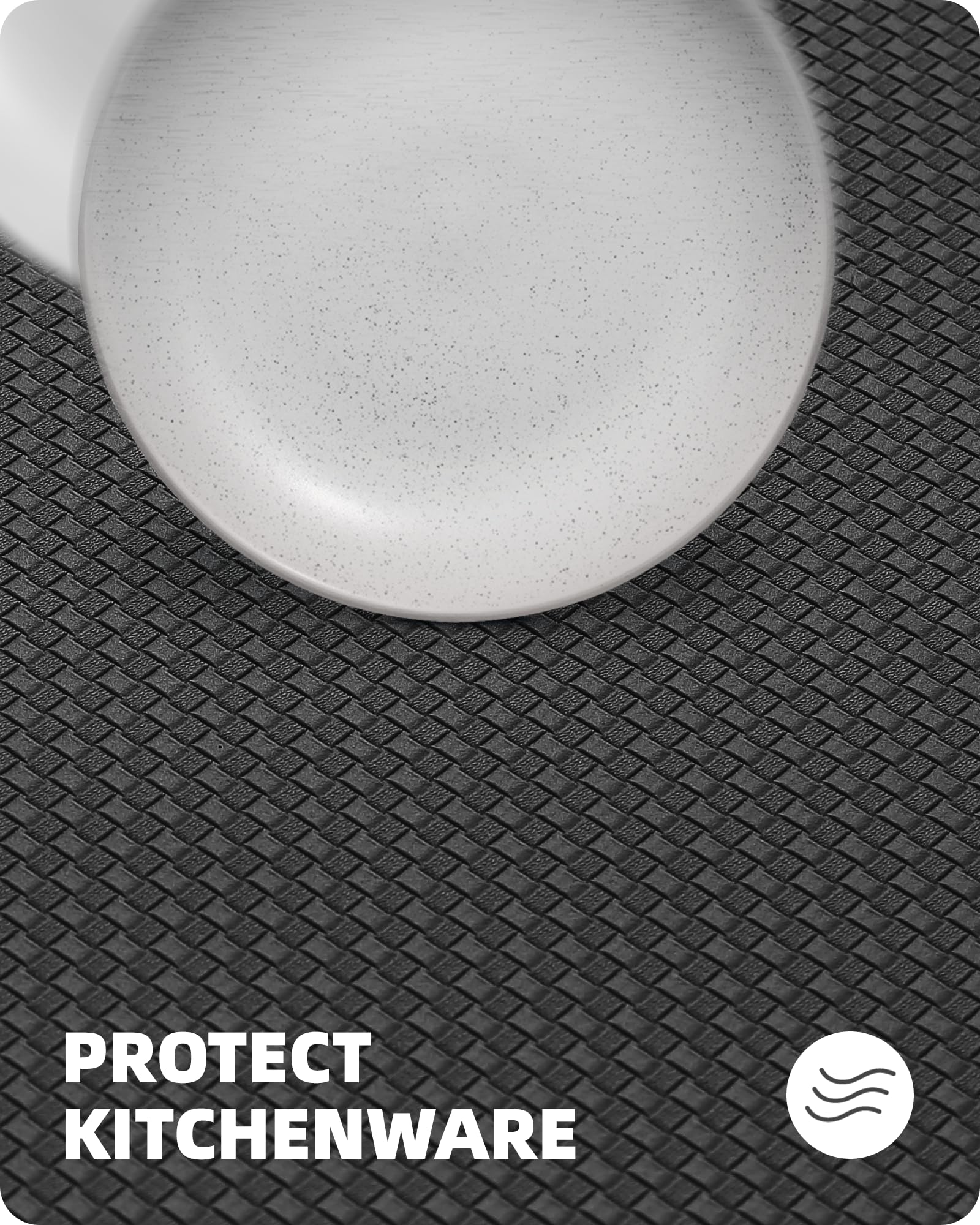 - [Rutschfest & Schutz]: Die Halterung dieser Küchenmatte besteht aus strapazierfähigem PVC mit einer diamantförmigen Anti-Rutsch-Textur, die eine hervorragende Rutschfestigkeit auf Holz-, Fliesen- und Betonböden bietet. Der 8 mm dicke Schwammkern bietet hervorragenden Schutz vor versehentlichem Herunterfallen von Geschirr.