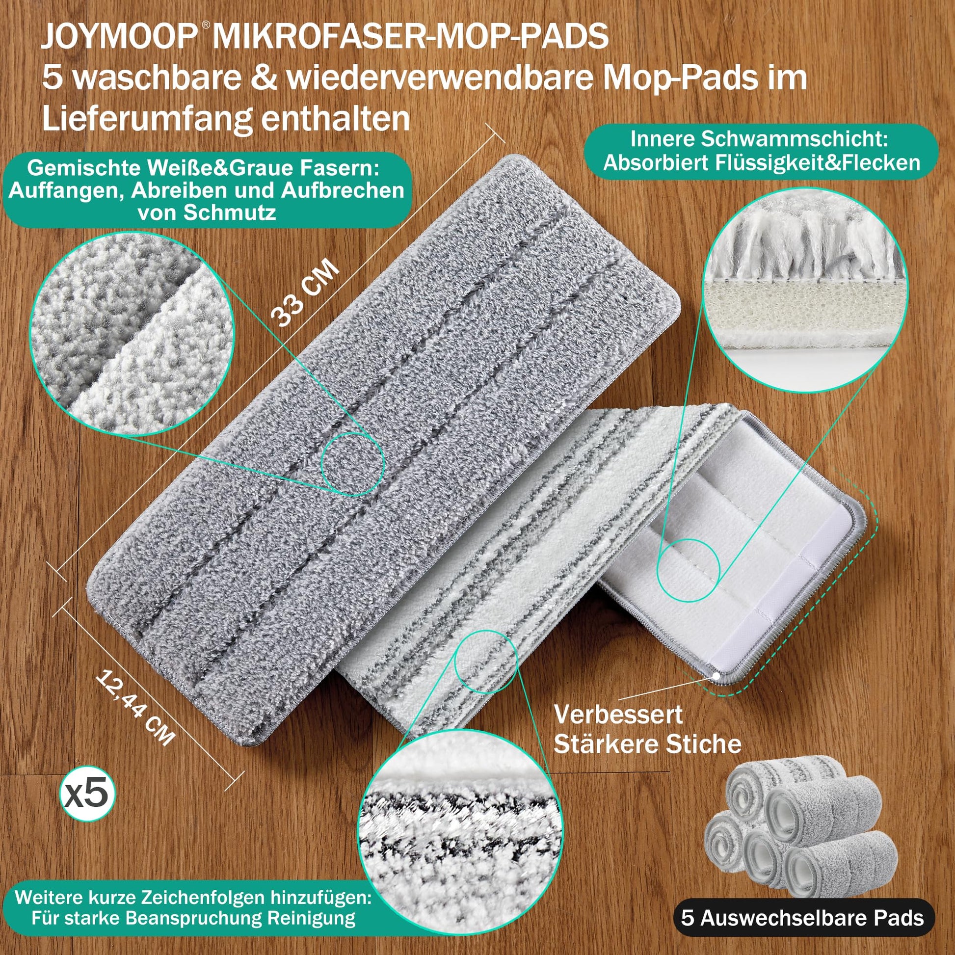 - [Wiederverwendbare Mikrofaserpads Nachfüllpackungen] 5 Mikrofaser Mop Pads Nachfüllpackungen kommen mit diesem Set. Angewandt auf 33 × 12,5CM Mop-Kopf. Starke Wasseraufnahme lässt Sie leicht jede Nass- und Trockenreinigung durchführen. Es wird empfohlen, die Pads alle 1-2 Monate zu ersetzen, je nach Nutzungshäufigkeit