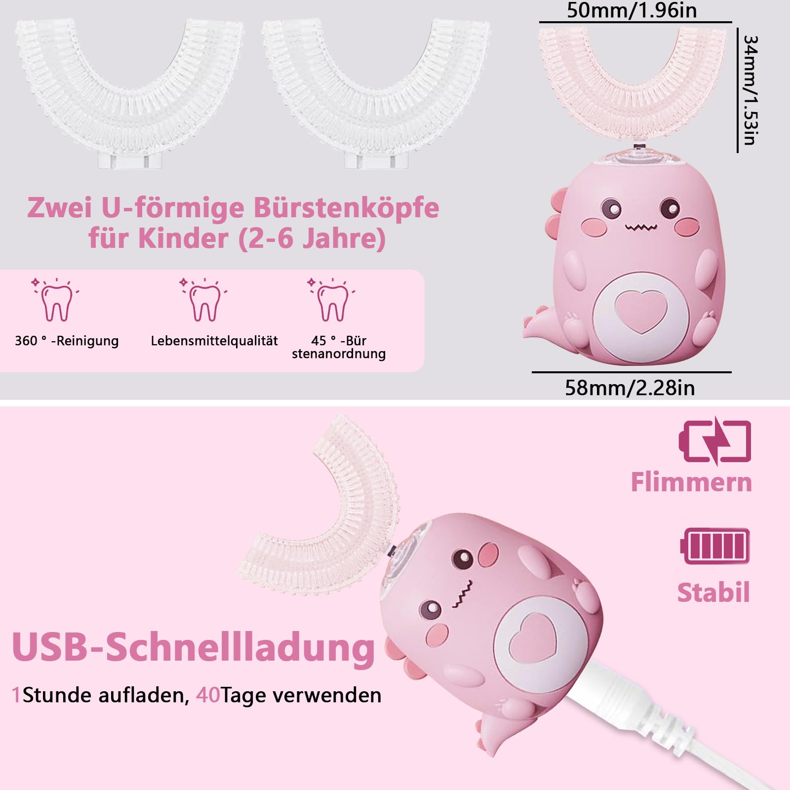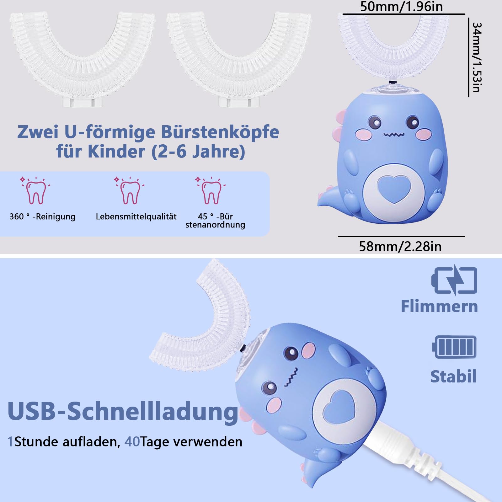 Lieferumfang: 1 elektrische Kinderzahnbürste, 3 U-förmige Bürstenköpfe, 1 Ladekabel
