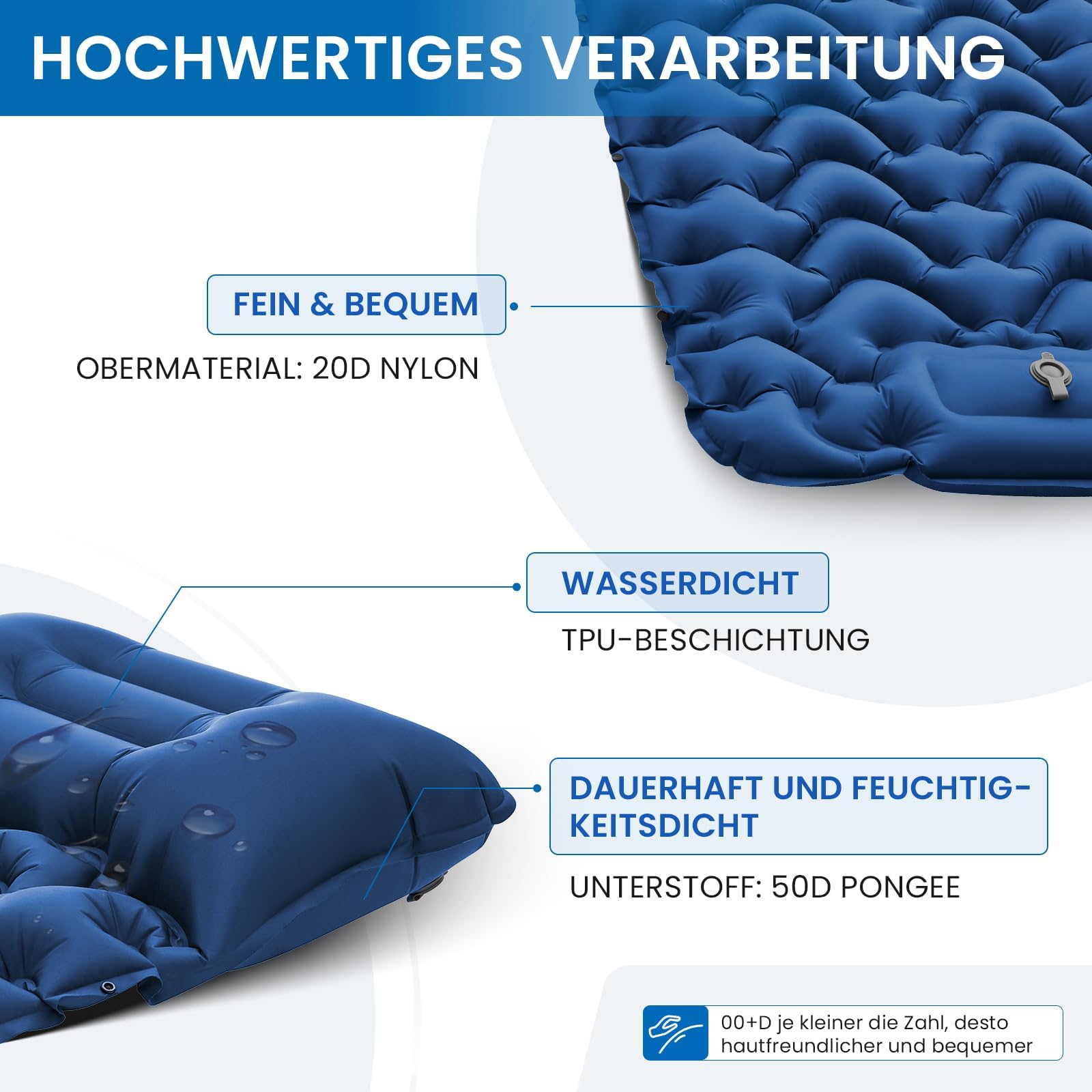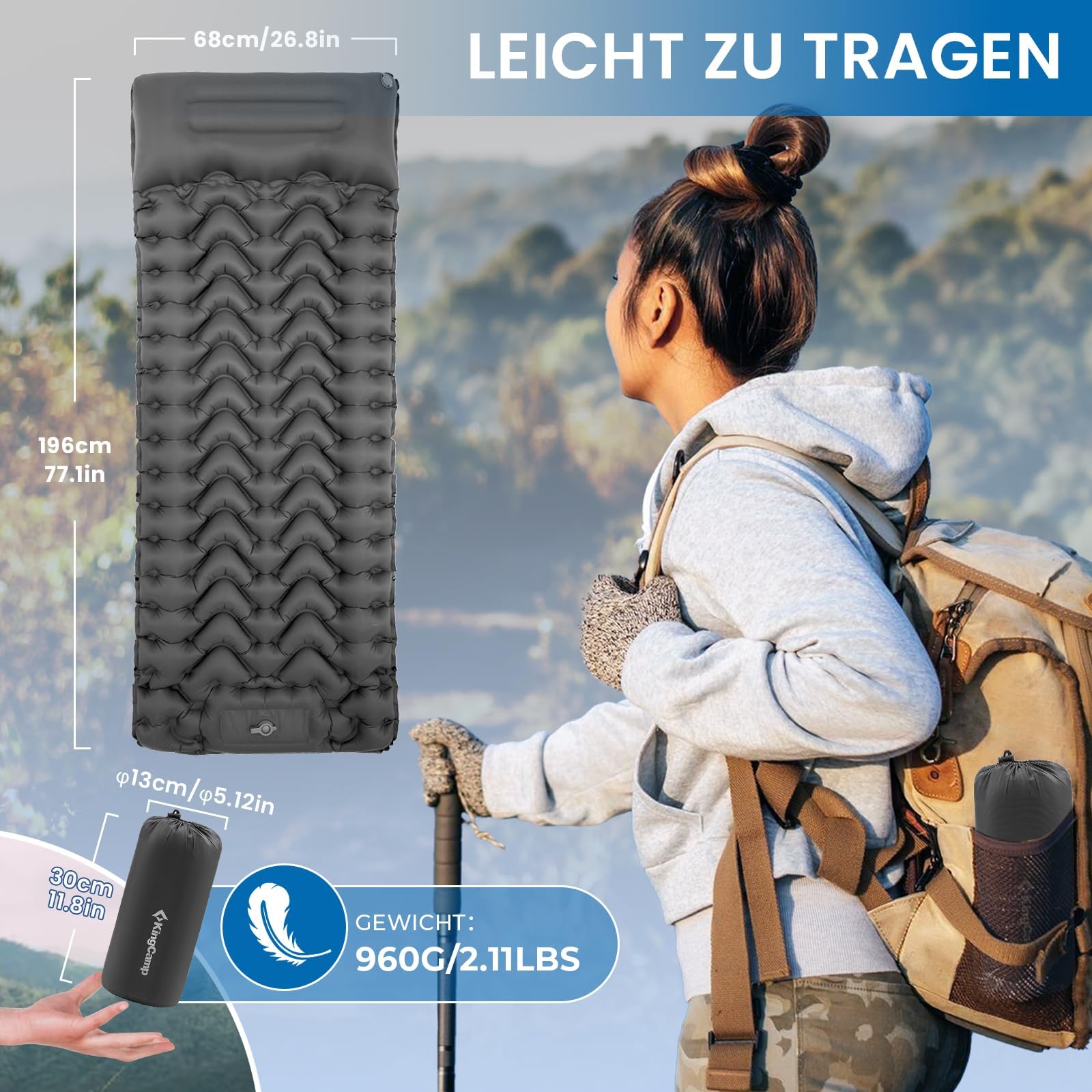 - Doppelluftventil: Das zwei Ventil auf dem Kissen mit lecksicherem Einwegluftsystem oben und großem Durchmesser unten ermöglicht einfaches Ablassen der Luft und volle Kontrolle über die Isomatte.