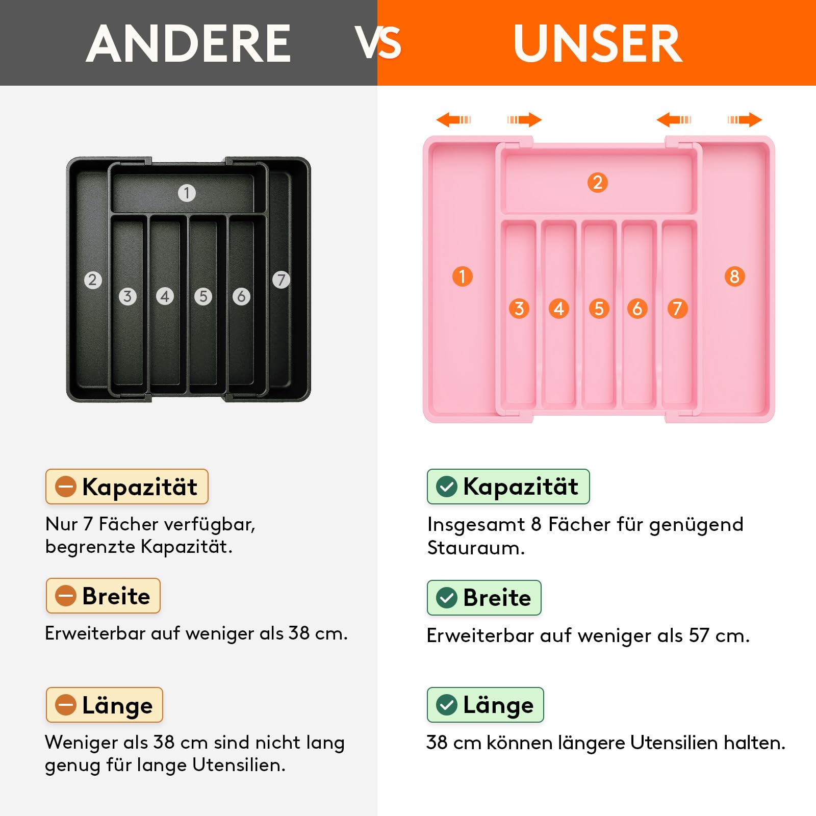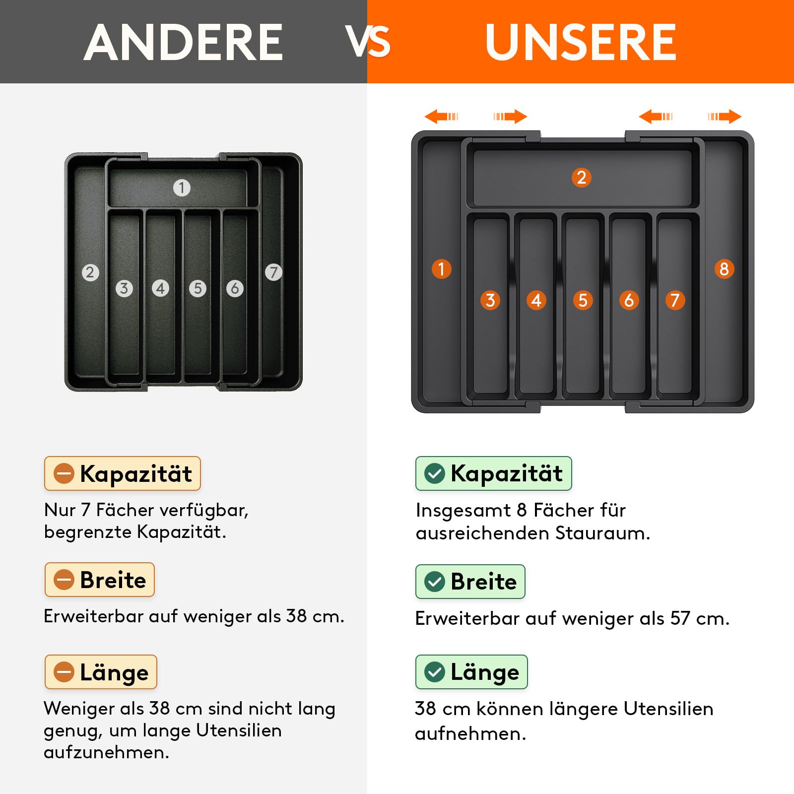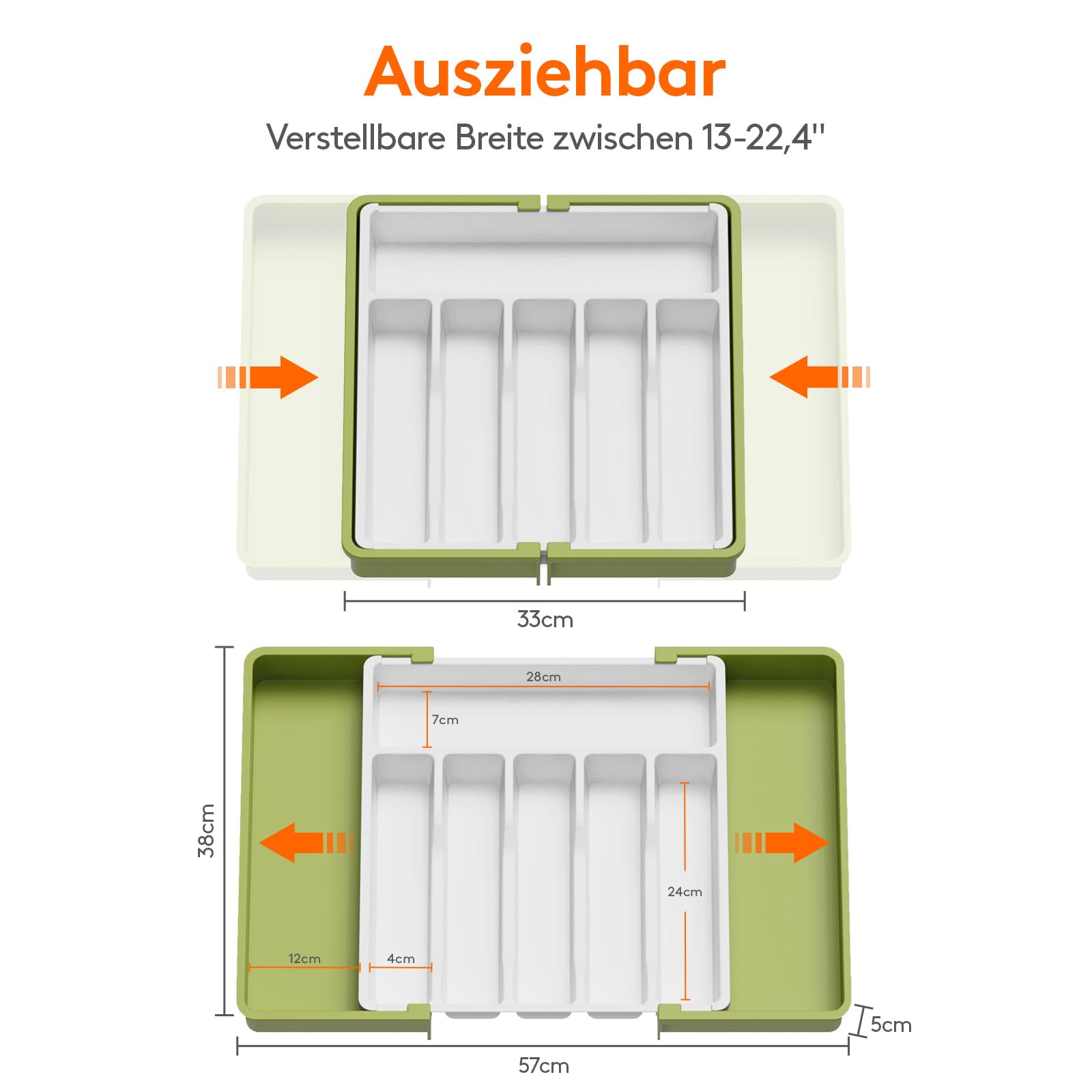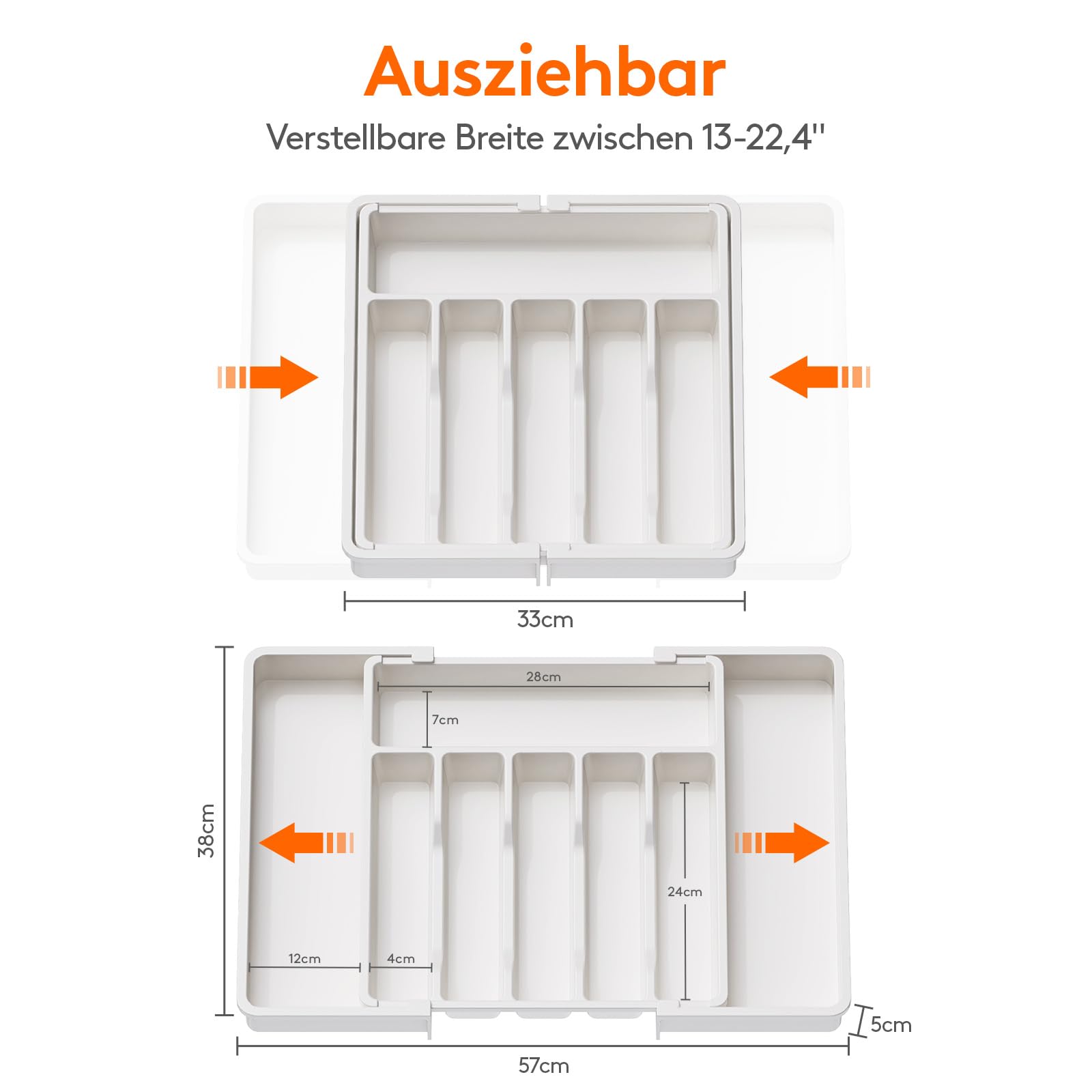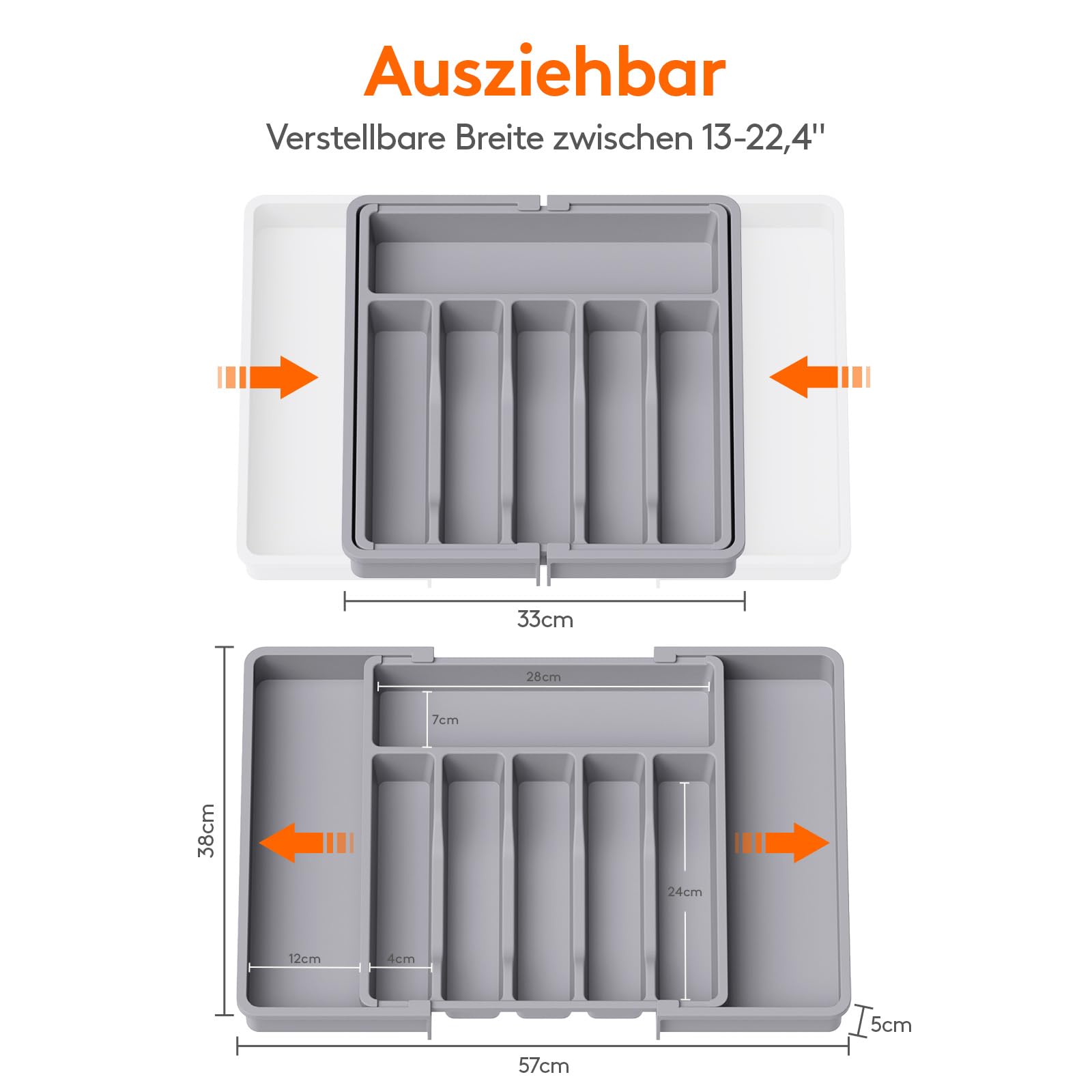 - Verstellbare Größe: Mit einer verstellbaren Breite von 33 bis 57 cm ist der Besteckeinsatz mit verschiedenen Schubladengrößen kompatibel. Im ausgezogenen Zustand hat der Besteckkasten eine Maße von 57 x 38 x 5 cm und im zusammengeklappten Zustand ist er 33 x 38 x 5 cm groß. Egal wie groß Ihre Küchenschubladen sind, dieser Organizer passt sicher hinein.