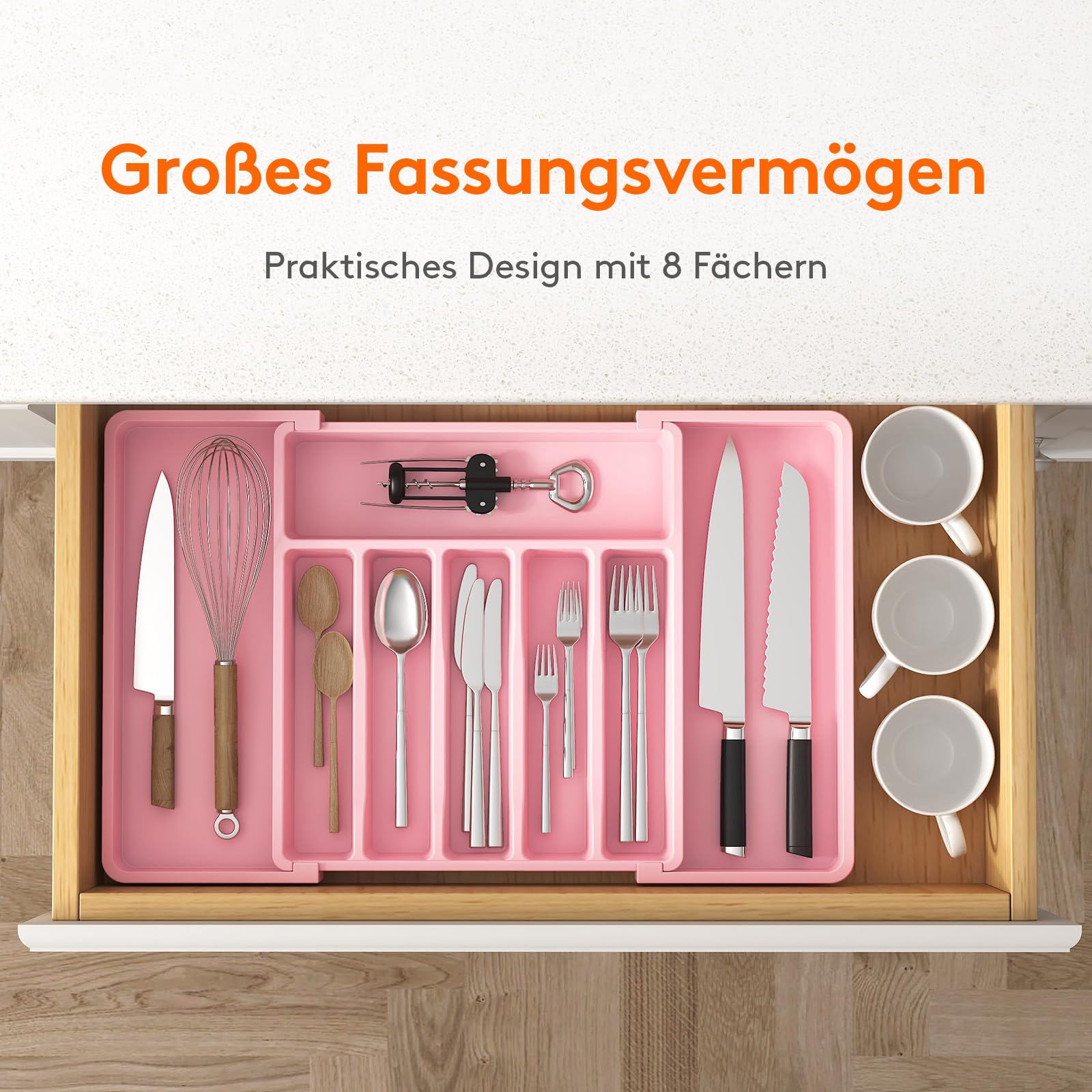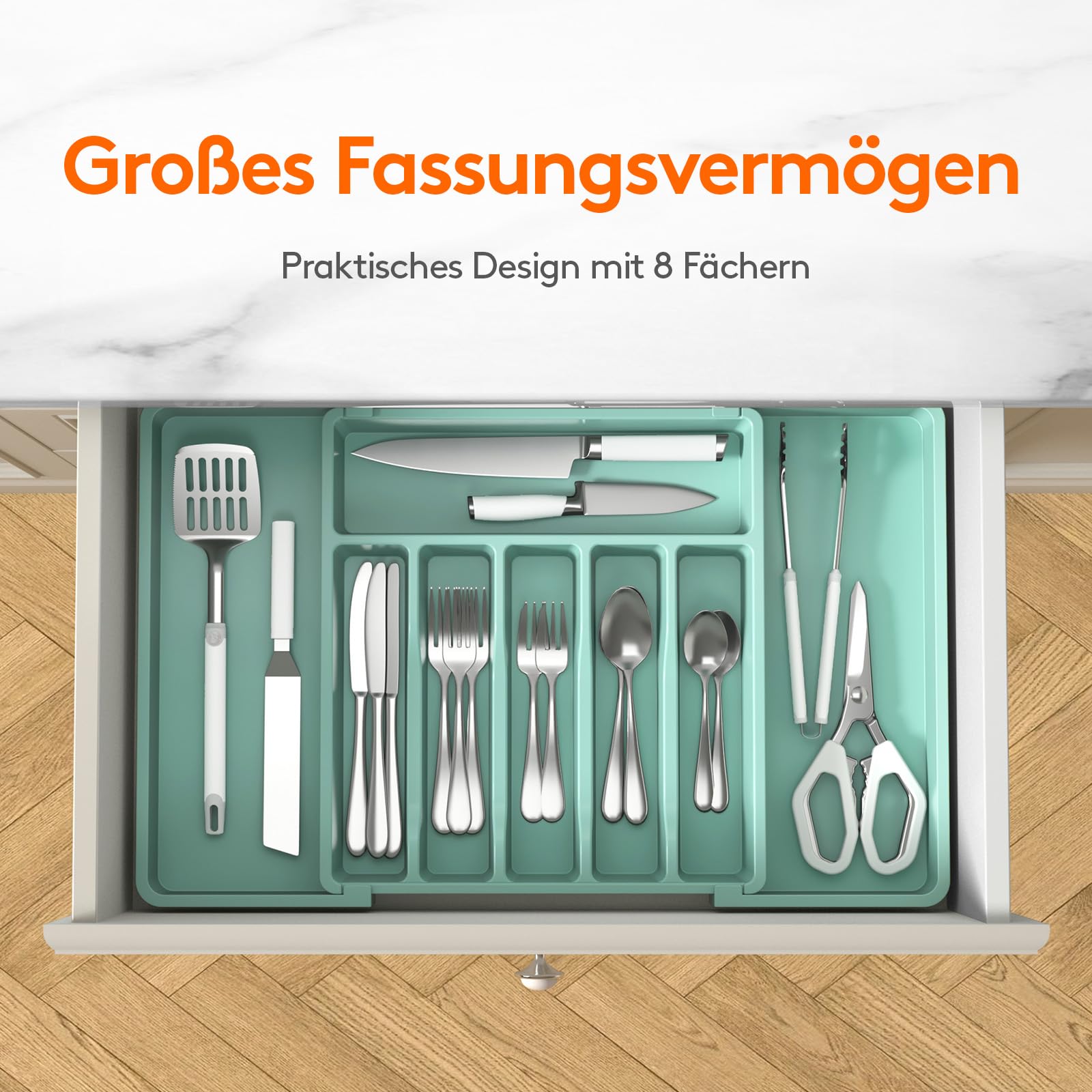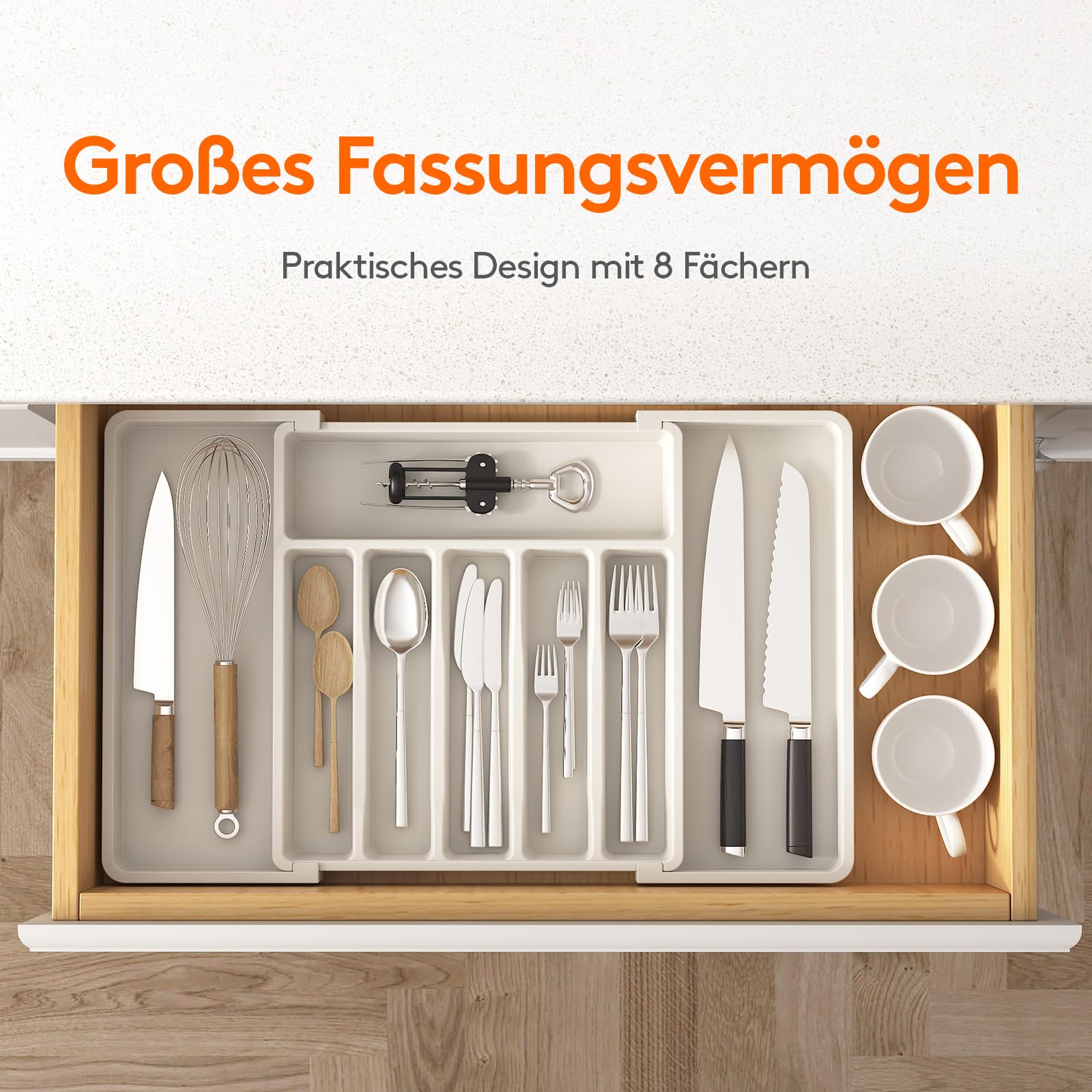 - Sortieren Sie Ihr Besteck: Mit 3 verschiedenen Größenoptionen und insgesamt 8 Fächern zum einfachen Sortieren und Aufbewahren können Sie mit diesem Organizer die benötigten Gegenstände leicht erkennen, identifizieren und herausnehmen.