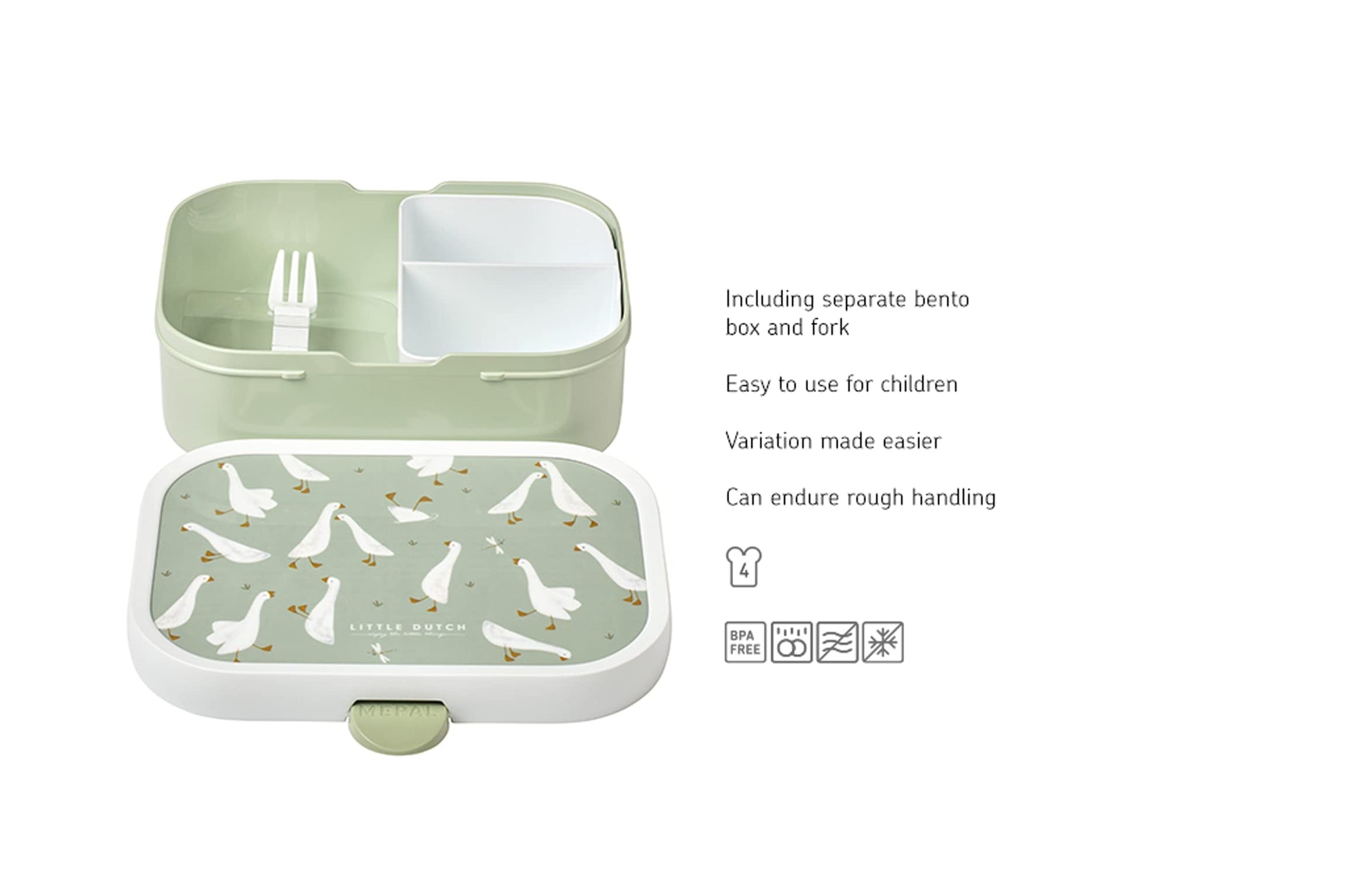 Little Farm Lunchbox Campus. Mit dieser Lunchbox wird die Variation zum Kinderspiel. In die Box passen problemlos vier Sandwiches oder Sie können die Bento-Box für zusätzliche Abwechslung verwenden. So wird jedes Mittagessen zu einer kleinen Party! Die Möglichkeiten für ein leckeres Mittagessen für Kinder sind nahezu unbegrenzt. Frisches Brot und buntes Obst mitnehmen? Oder ein kleiner pikanter Snack für die Schule? Käsestücke, eine Wurst, Nüsse oder Trockenfrüchte? Es ist ganz einfach, man muss nur auswählen und mischen und alles schön getrennt halten! Die Bento-Box unterteilt die Lunchbox in verschiedene Abschnitte. Mit den zwei separaten Teilen hält die Bento-Box alles schön frisch in Ihrer Lunchbox. Würden Sie lieber 'nur' vier Sandwiches essen? Nehmen Sie das Bento heraus und Sie haben viel Platz! Unnötig zu erwähnen, dass sowohl das Bento als auch die Lunchbox spülmaschinenfest sind.
