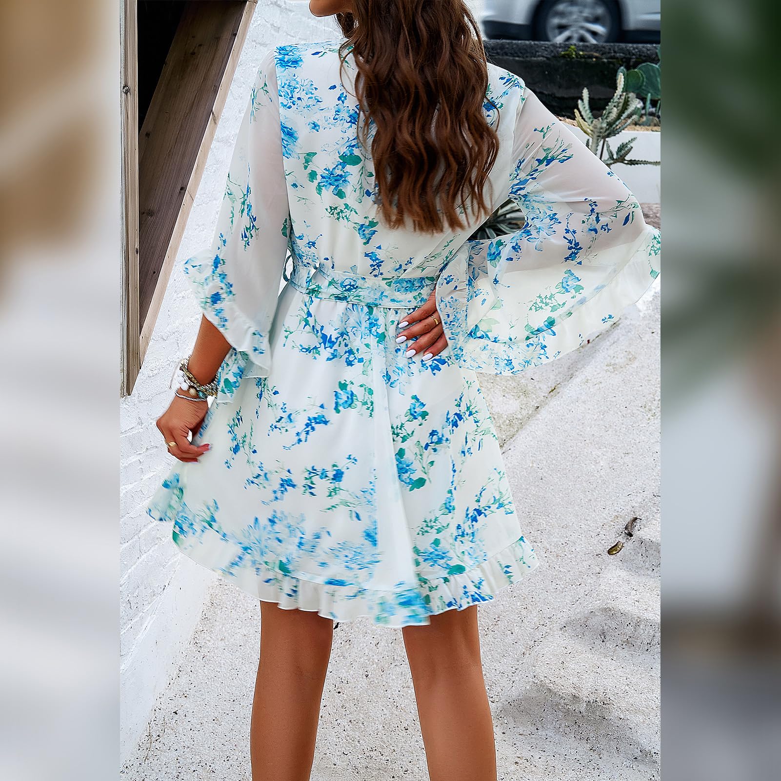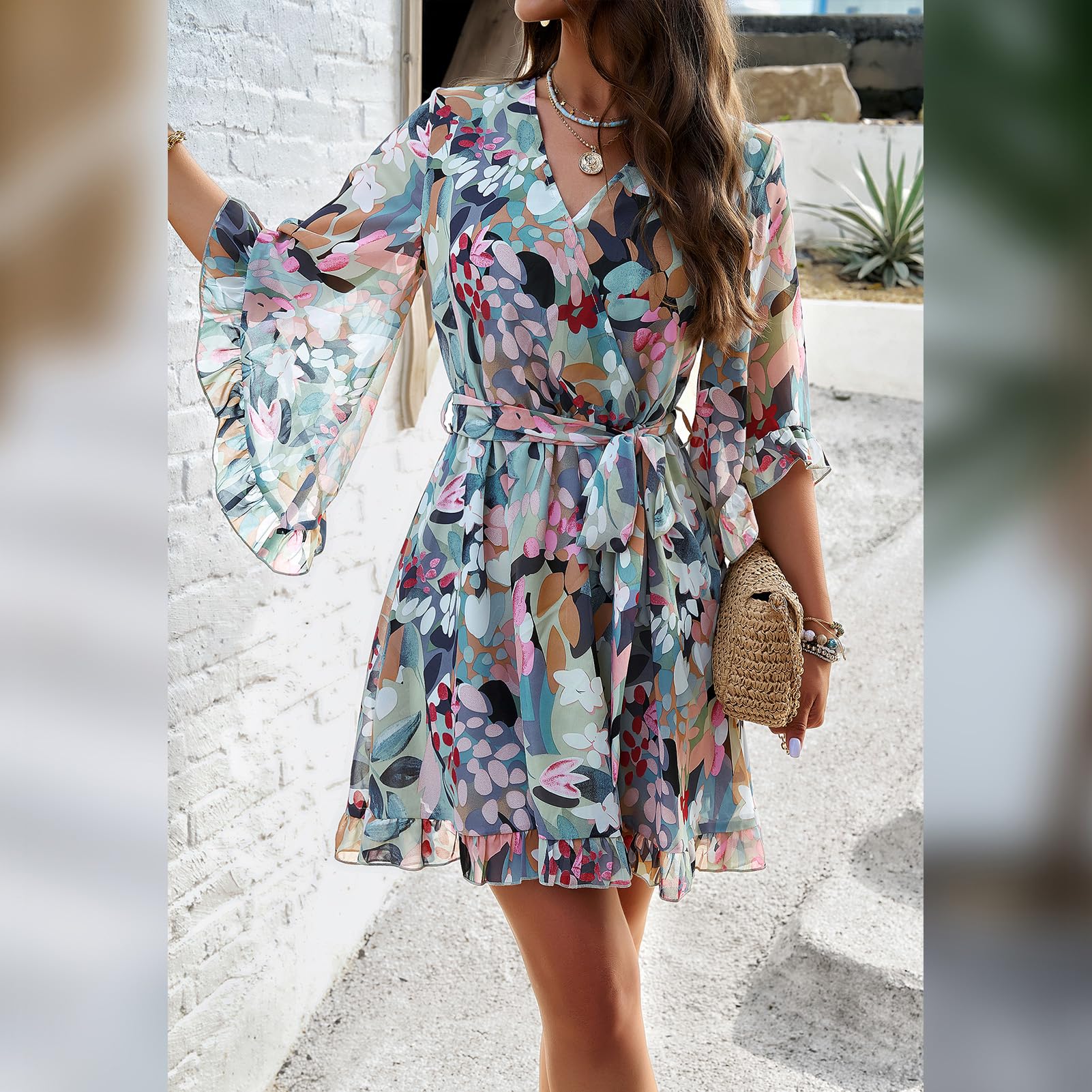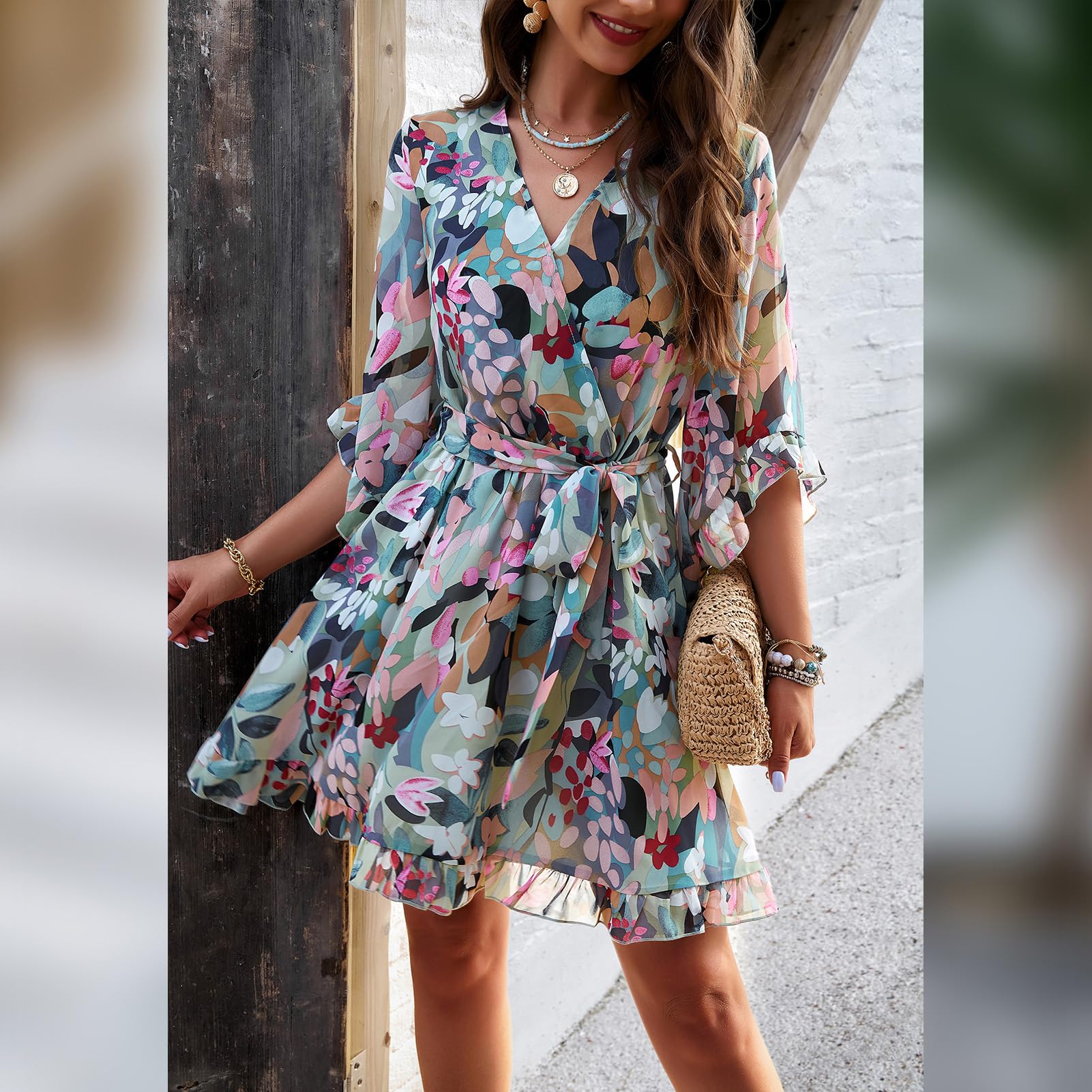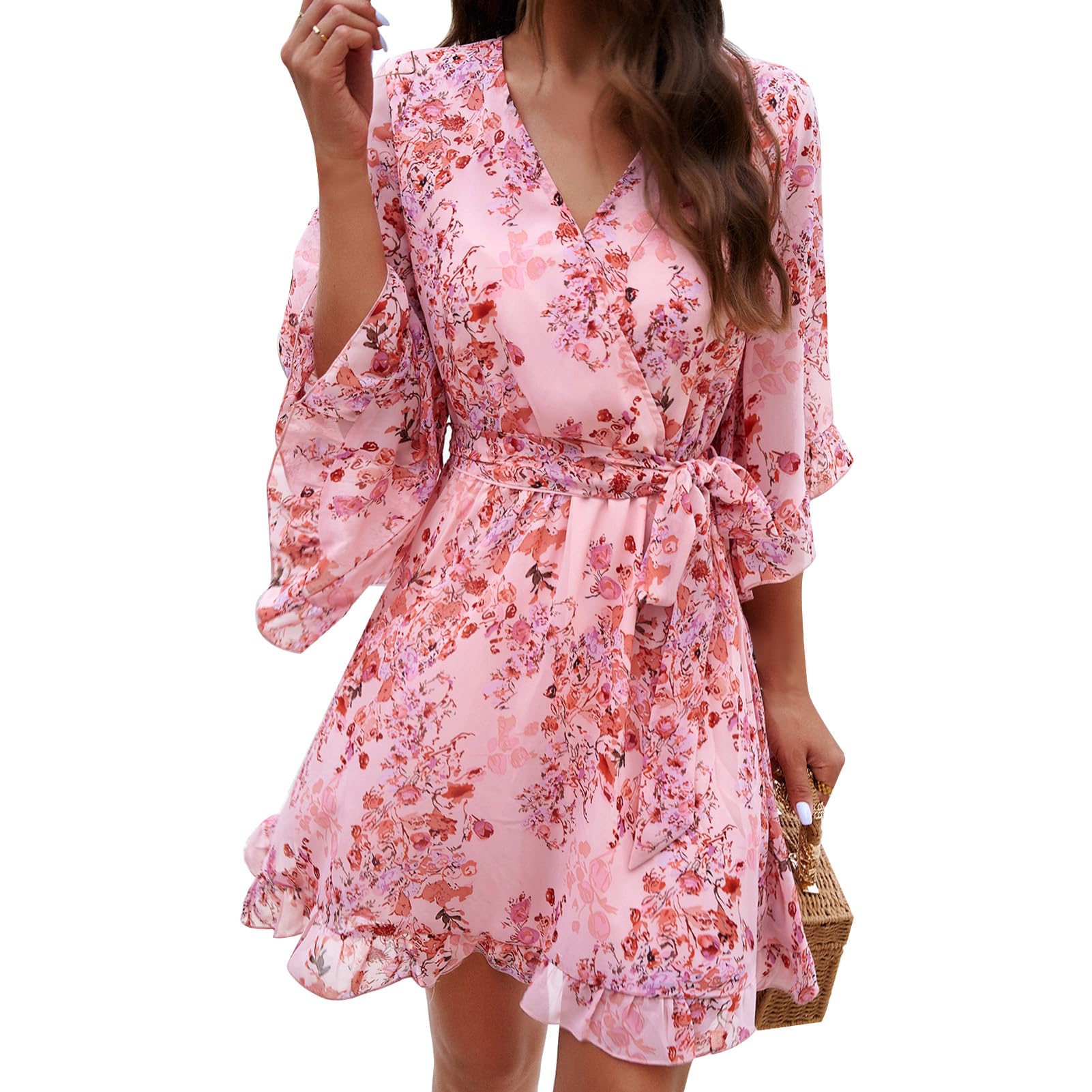 Odizli Sommerkleid Damen Kurz Elegant Blumen Chiffon V-Ausschnitt Wickelkleid