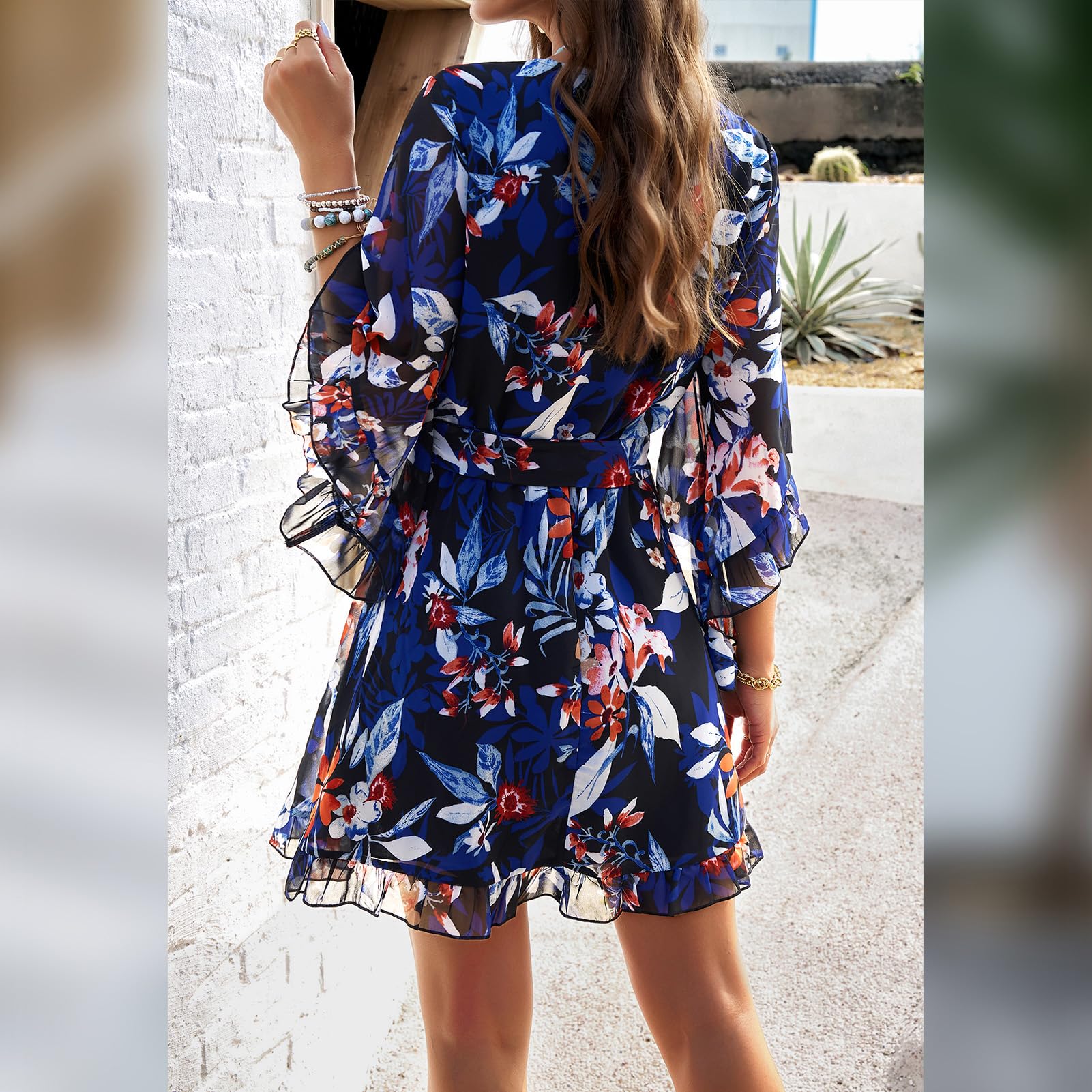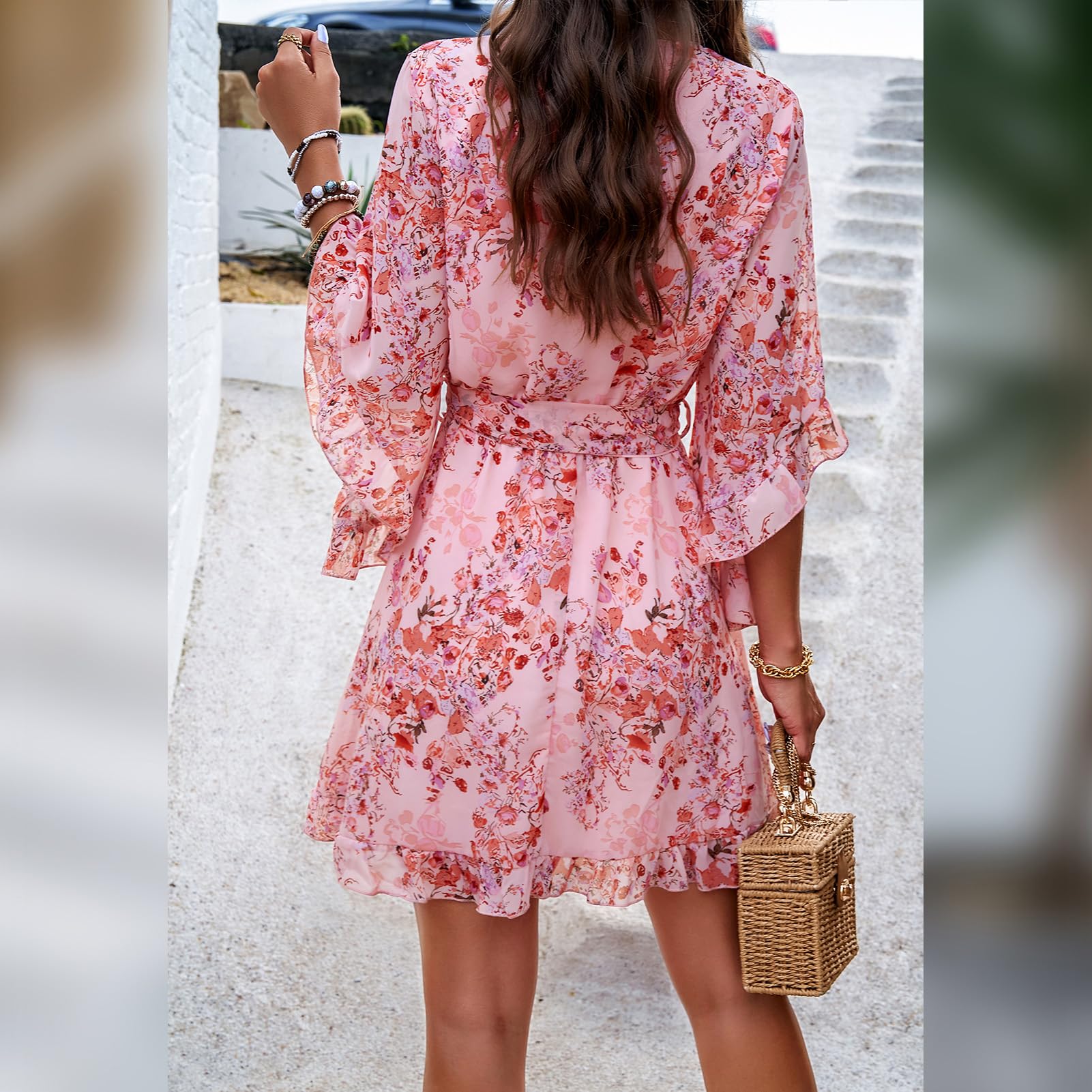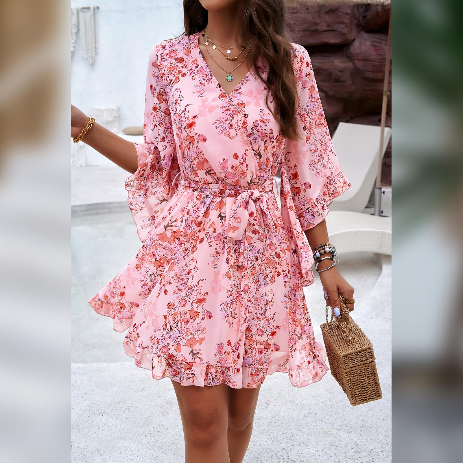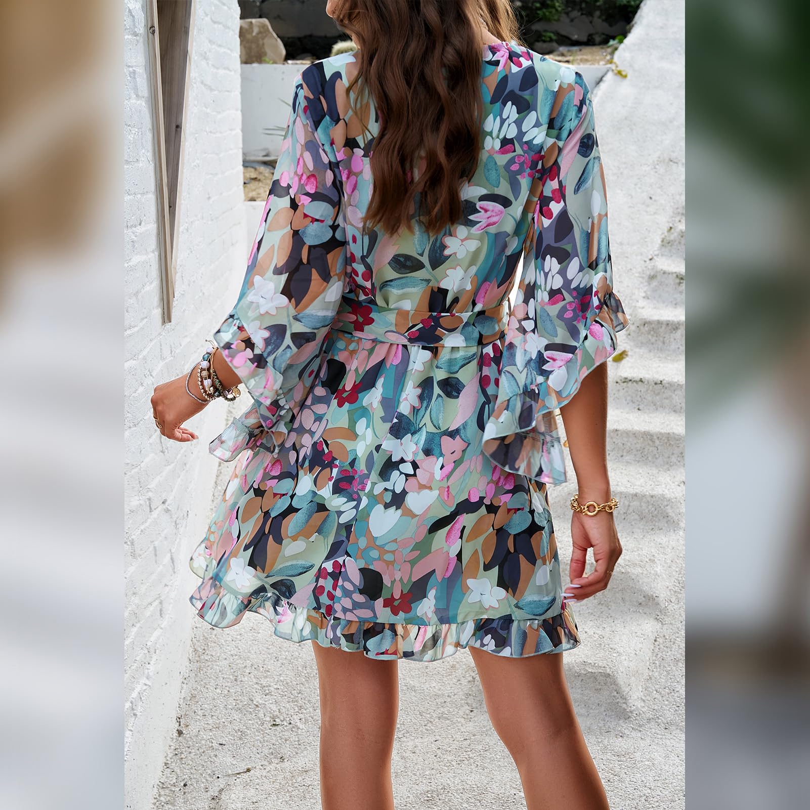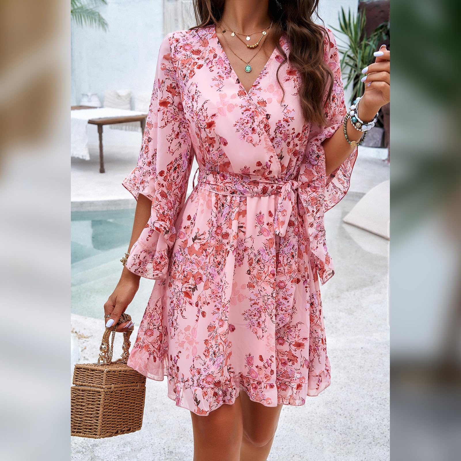 Odizli Sommerkleid Damen Kurz Elegant Blumen Chiffon V-Ausschnitt Wickelkleid