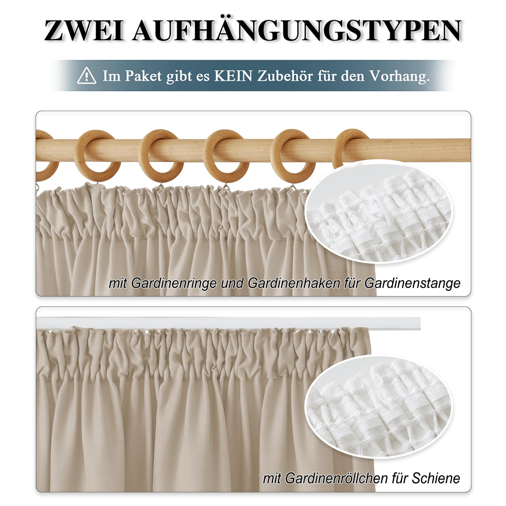 - Das Paket: Verkauft als zwei Stücke Leinen Gardinen. Höhe 245 cm x Breite 140 cm für pro Stück. (Die Höhe wird von dem Oberteil der Kräuselband gemessen.) Im Paket gibt es KEIN Zubehör für den Vorhang, brauchen Sie das Zubehör separat zu bestellen!