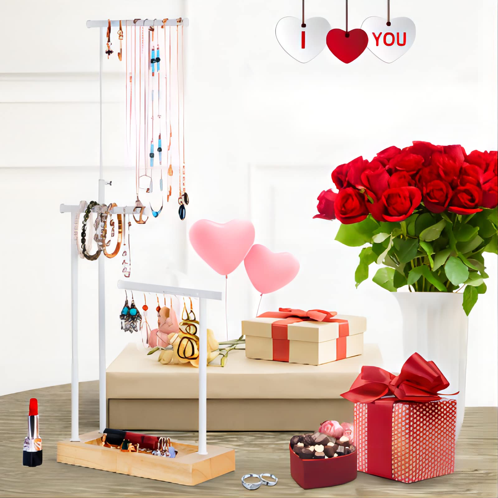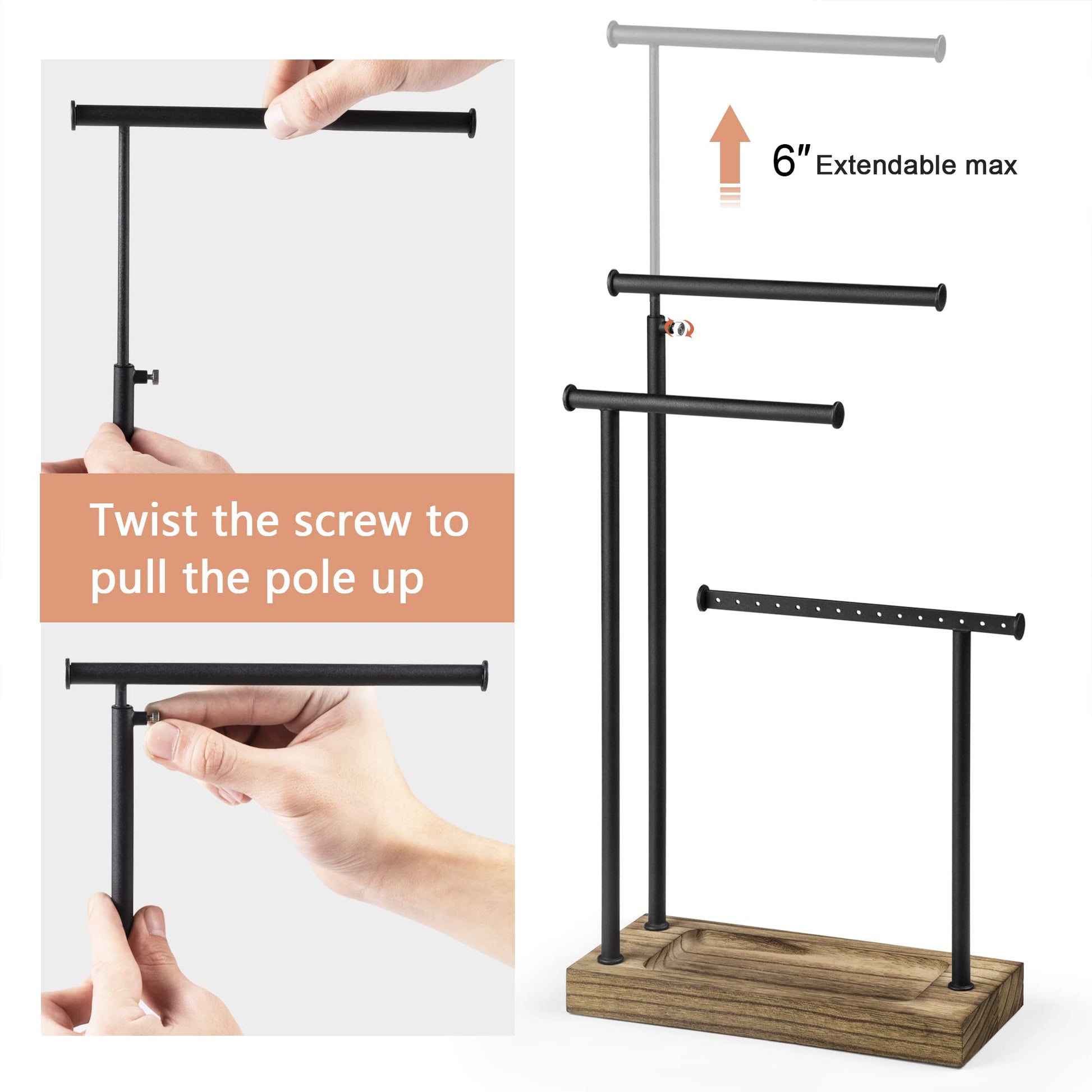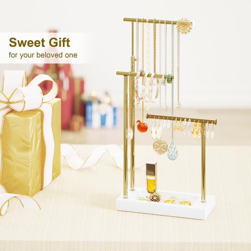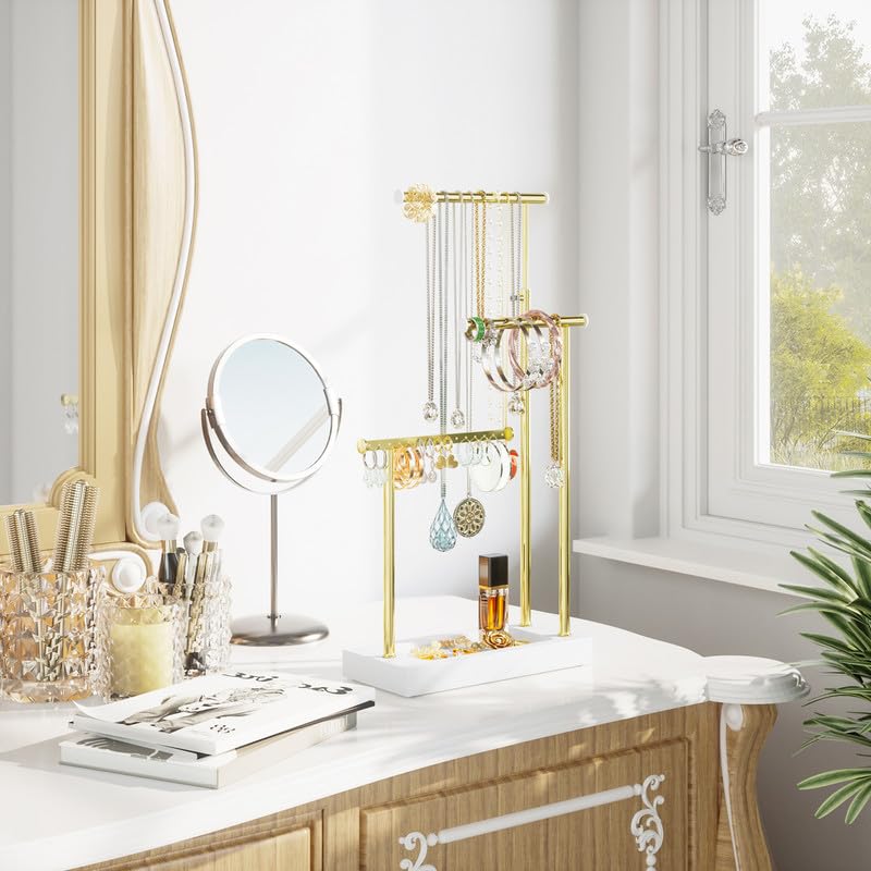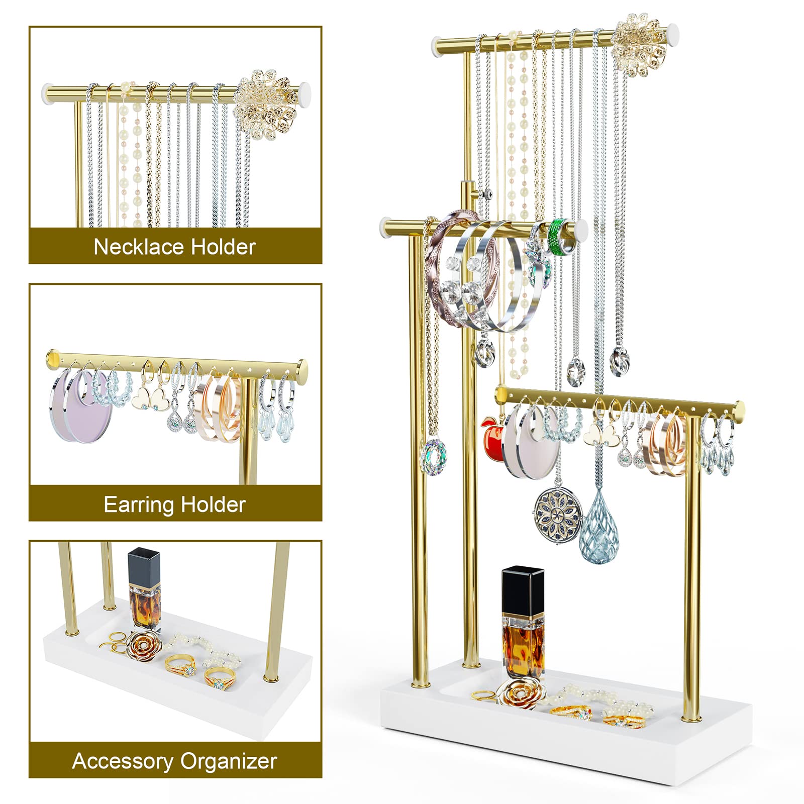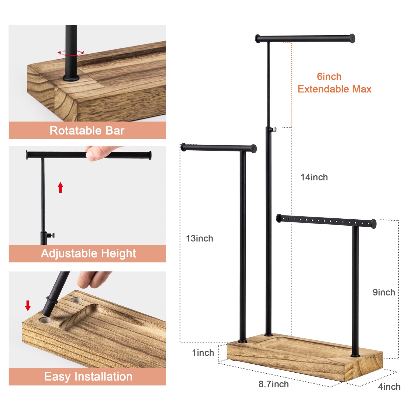 - Für Jede Art Schmuck: Die höchste verstellbare Querstange (Max Höhe 51 cm) kann Ihre längste Kette perfekt halten. Die Niedrige mit Ohrringsteckern hilft Ihnen beim Organisieren die Ohrringe. Es gibt eine kleine Kante ringsum, lagern wie Ringen, Lippenstifte oder Haarband sowie andere Schmuckstücke
