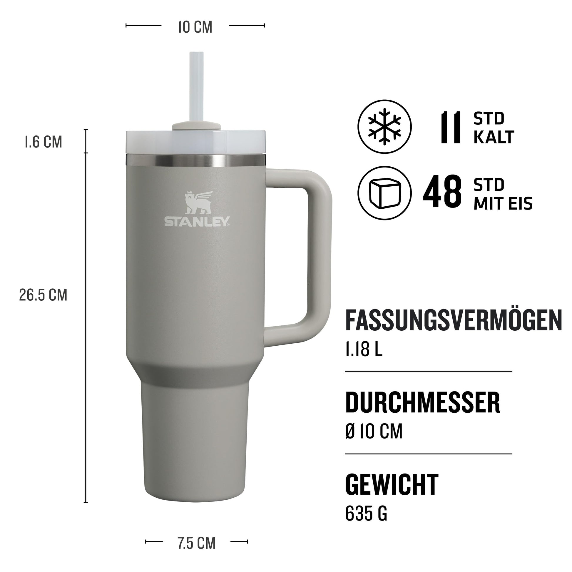 - 2 Tage eisgekühlt: Die Stanley Cup Vakuum-Isolierung hält dein Wasser 11 Stunden kalt und eiskalte Getränke bis zu 2 Tage kalt. Der Quencher Becher ist eine robuste Thermosflasche mit Deckel und Strohhalm und fasst 1,2L Wasser