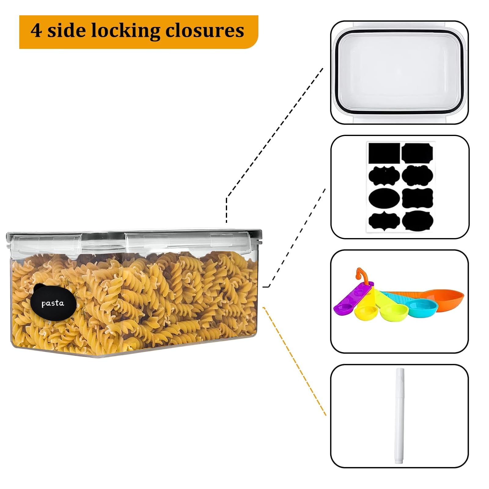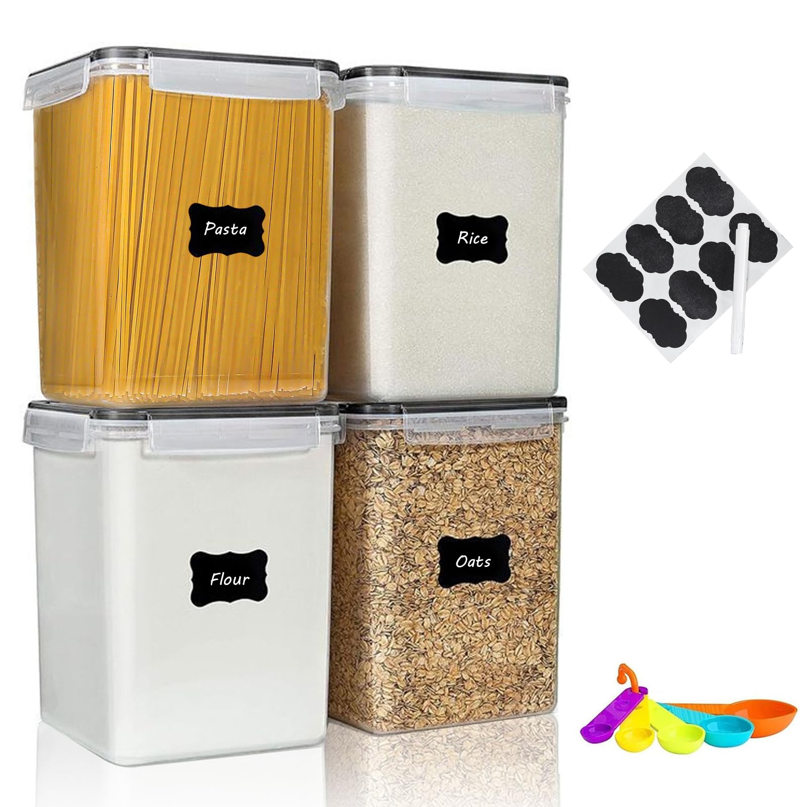 - Reusable labels, measuring spoons and a pen - Except 24 containers for dry food, you will also receive black labelling paper, a set of measuring spoons and a pen. You can write your name on the labeling paper and stick it on the corresponding container for easy access.