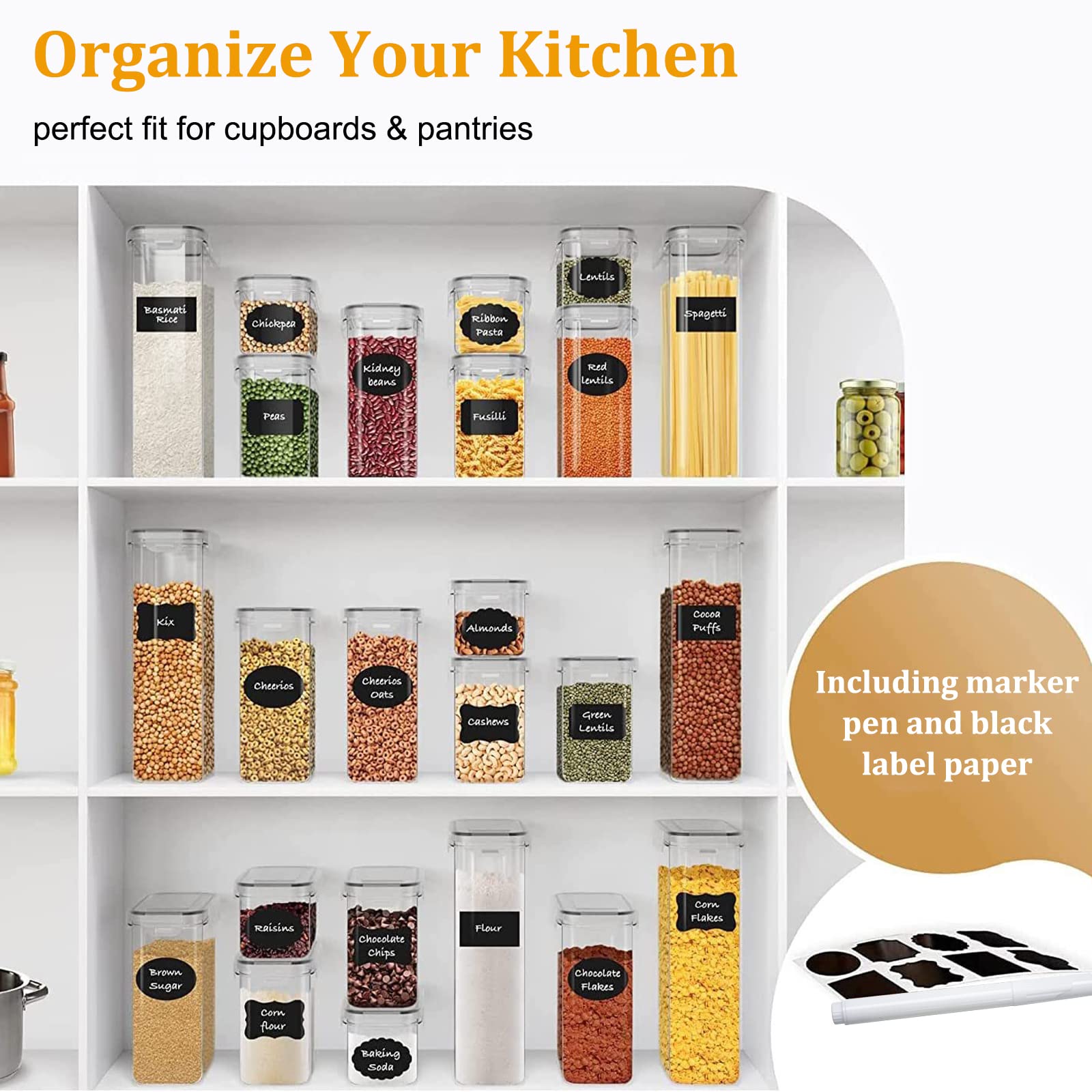 stusgo 24 Airtight Food Storage Containers with Lids Plastic Containers for Kitchen and Organization Cereal Flour and Sugar BPA Free Includes Spoon, Labels and a Pen