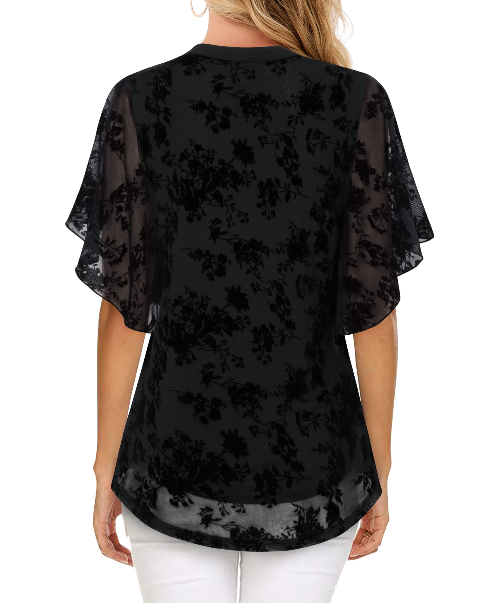 Vafoly Bluse Damen Elegant Kurzarm Sommer Tunika V-Ausschnitt Mesh Oberteil Blumen Doppellagige Tunika